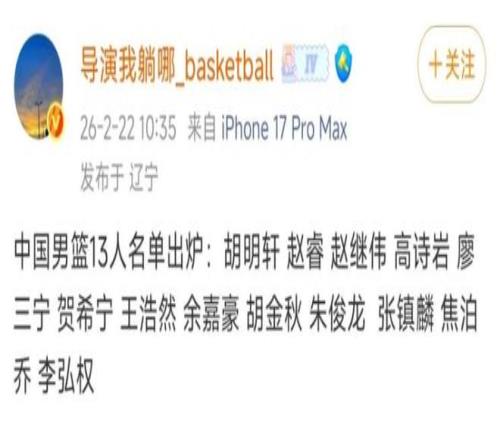 中國男籃國家隊已經集訓了一段時間,甚至春節期間都沒有放假。按照賽程安排,中國男籃將會在26日在客場對陣日本男籃,這場比賽對中國男籃來說非常重要,球隊將會於23日出發從上海直飛衝繩,備戰這場比賽。媒體人“導演我躺哪兒”透露了出戰這個窗口期世預賽的球員名單,總共有13人入選,分別是:胡明軒、趙睿、趙繼偉、高詩岩、廖三寧、賀西寧、王浩然、餘嘉豪、胡金秋、朱俊龍、張鎮麟、焦伯喬和李弘權。
