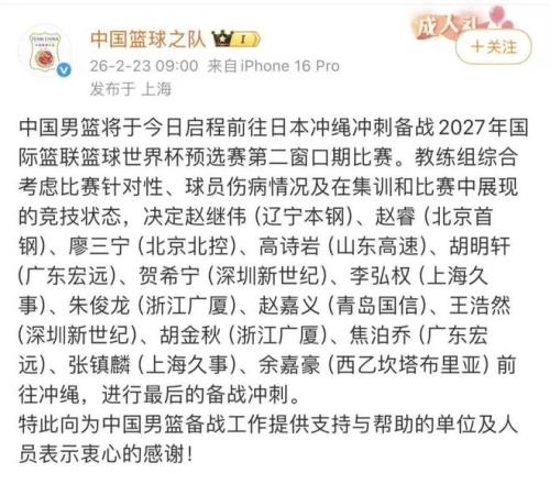 北京時間2月26日18:00,中國男籃將在客場對陣日本,最終的12人名單會在賽前產生。3月1日16:00,中國男籃對陣中國台北。