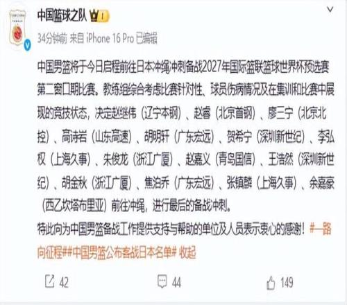 球迷期盼的中國男籃大名單,今天終於官宣了,他們是趙繼偉、趙睿、廖三寧、高詩岩、胡明軒、賀希寧、李弘權、朱俊龍、趙嘉義、王浩然、胡金秋、焦泊喬、張鎮麟、餘嘉豪。這份大名單完全體現了主帥郭士強的特點,那就是迷戀舊部,不敢起用表現出色的新人。