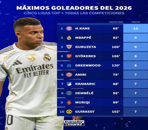 北京時間2月24日,德轉統計出了2026年至今歐洲五大聯賽球員各項賽事的進球榜,哈裏-凱恩以13球排名第一,姆巴佩9球位列第二,哲凱賴什、格林伍德、登貝萊以及吉拉西上榜。