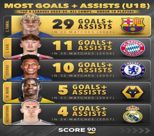 北京時間2月24日,Score 90統計出了本賽季至今歐洲五大聯賽U18球員各項賽事直接參與進球數的排行榜,亞馬爾29球斷檔領先,倫納特-卡爾11球第二,埃斯特旺10球第三。