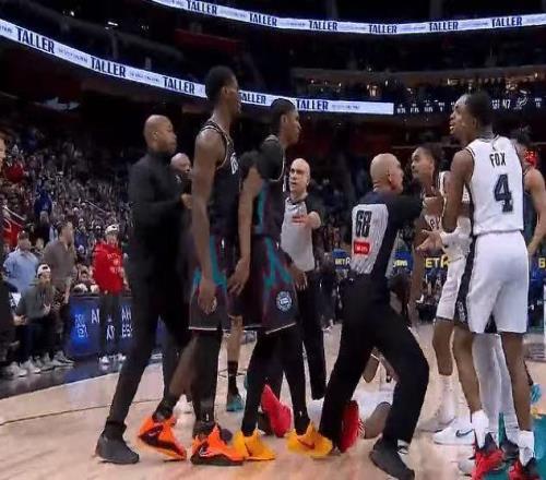 卡斯爾還沒來得及反應,馬刺隊的凱爾登-約翰遜就上前為他出頭,推搡了康寧漢姆。於是,活塞隊的球員圍了上來,全明星中鋒杜倫用手指著凱爾登-約翰遜,嘴裏念念有詞,於是裁判趕緊將兩隊的球員分開製止衝突。