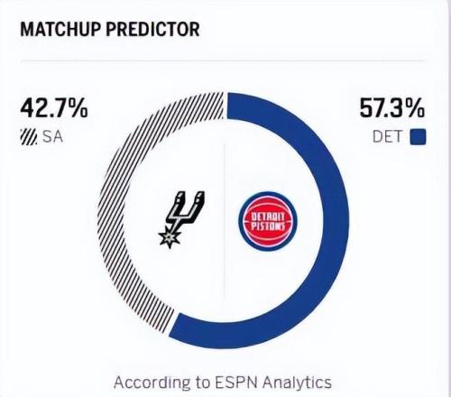 反觀馬刺,近期的狀態火熱,憑借一波8連勝,拿到40勝16負的戰績,位居西部第二,與雷霆的差距隻有3個勝場,並甩開身後的掘金5個勝場差。馬刺隊過去兩場主場比賽分別擊敗太陽和國王,延續了連勝勢頭。上一場對陣國王,馬刺以139比122兵不血刃取勝,核心文班亞馬延續無解表現,拿下28分15個籃板6次助攻的全麵數據,帶領球隊多點開花、輕鬆取勝。此役,活塞的杜倫與內線怪物文班亞馬的較量,無疑看點十足。賽前,美媒ESPN預測本場比賽,馬刺取勝的概率為42.7%,活塞勝率57.3%。