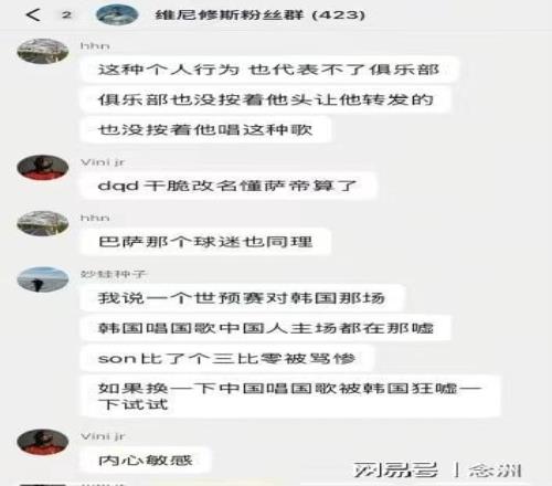 據網友爆料,在國內的一個423人的維尼修斯粉絲群裏麵,某球迷表示:“我至今都不知道這些人叫喚什麽,發個圖片咋了?赫伊森說啥了?那個人不是中國人?趕緊把他開除國籍吧。”