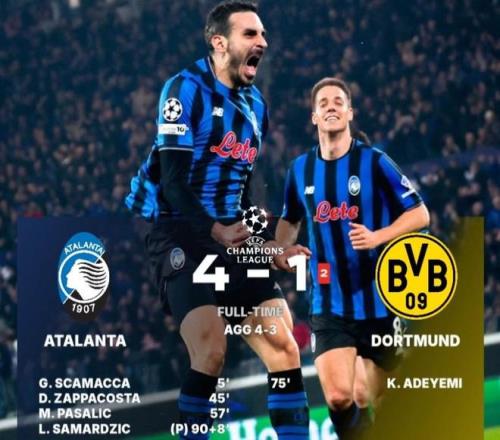 北京時間2月26日,在歐冠淘汰賽附加賽次回合的比賽中,亞特蘭大在首回合0-2告負的情況下,最終依靠斯卡馬卡、紮帕科斯塔以及帕薩利奇的進球,外加薩馬爾季奇讀秒的點球絕殺4-1大勝多特蒙德,兩回合總比分4-3逆轉晉級。