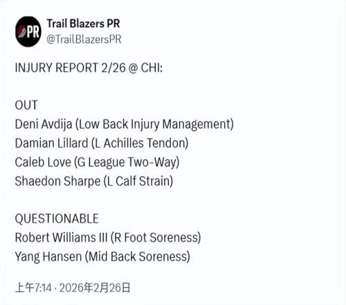 北京時間2月26日,開拓者已經召回楊瀚森,並更新了他的傷情。明日出戰公牛的狀態是出戰成疑(50%上場可能),他的傷病被標注為背部中段酸痛。此前,前方消息是他遭遇了背部拉傷。此外,羅威因右腳酸痛也被列為出戰成疑,阿夫迪亞、利拉德、樂福和夏普被列為缺陣狀態。