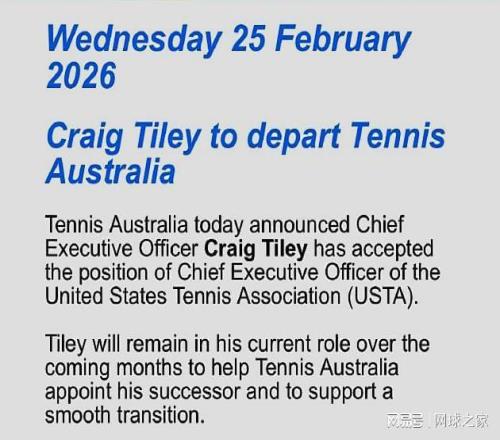 北京時間今晨,澳大利亞網球協會宣布,其首席執行官兼澳網賽事總監克雷格-泰利已接受美國網球協會(USTA)首席執行官一職,將在數月內走馬上任。在接下來的幾個月時間裏,泰利將繼續留任現職務,並幫助澳大利亞網球協會物色繼任者,協助完成平穩過渡。
