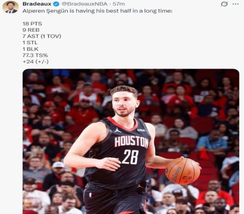 此役阿爾佩倫-申京表現非常出色,首節9分鍾裏他就已經3中3拿到6分4籃板4助攻,次節9分鍾裏更是6中3+三分1中1拿到12分5籃板3助攻,半場18分9籃板7助攻1搶斷1蓋帽1失誤,真實命中率77.3%,正負值+24。國王的內線群根本無法限製他分毫。