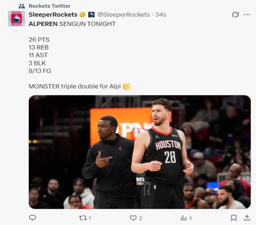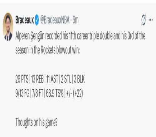 休媒曬出申京此役的數據,盛讚此役他拿到了怪物一般的三雙數據。本賽季申京場均6.3助攻實際是火箭的第一組織進攻點,他繼續朝著約基奇的方向進發。