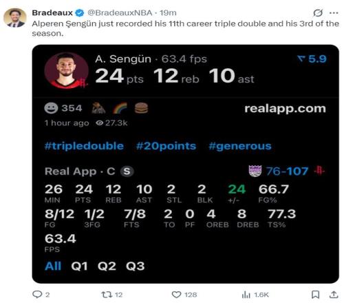 第三節申京僅打8分鍾後他已經完成了三雙數據,這時候火箭也領先國王達到30+,申京12投8中斬獲24分12籃板10助攻2搶斷2蓋帽的頂級三雙數據。