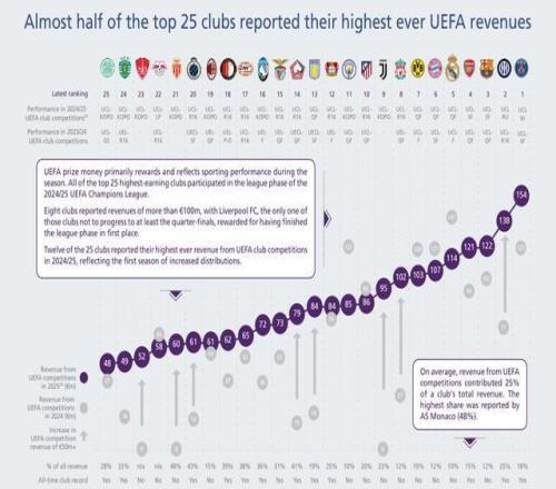 在這25家俱樂部中,有12家在2024-25賽季報告了其在歐足聯俱樂部比賽中有史以來最高的收入,這反映了分配增加的首個賽季。