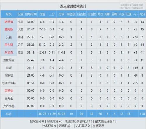 艾頓更衣室發泄不滿之後,今天3投1中僅得2分4板,正負值-24全場最低。詹姆斯出戰35分鍾,投籃16中7,三分3中0,罰球2中1,拿到15分6板5助,正負值+5。太陽最後一攻,阿倫突進內線,詹姆斯想起跳封蓋,跟東契奇撞一起。