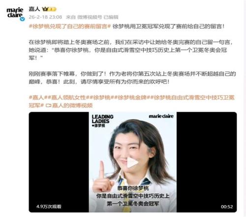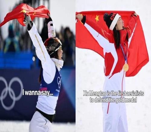 她說:“恭喜你徐夢桃,你是自由式滑雪空中技巧曆史上第一個衛冕冬奧會冠軍!”