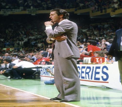 如果說最初的形象是為了匹配“表演時刻”的浮華,那麽萊利用持續的勝利和卓越的執教,將這種風格升華為一種領導力的象征。他帶領湖人在1982、1985、1987和1988年四奪總冠軍,打造了80年代最具觀賞性的球隊之一。
