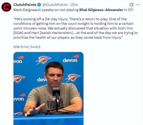北京時間2月28日,NBA常規賽,雷霆127-121逆轉掘金,這場比賽亞曆山大傷愈複出,他休息了足足9場比賽,掘金一度領先雷霆16分之多,可雷霆在下半場開始猛烈反擊,末節兩隊都手握絕殺機會隻可惜都未能命中,加時賽掘金的小哈達威連續失誤坑苦約基奇、穆雷。