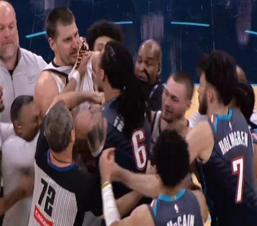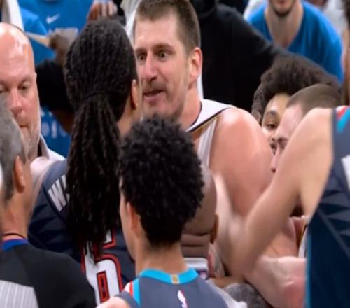 雷霆球員傑林衝上去幫隊友多爾特出頭,他與約基奇推搡互相撕扯球衣,雙方多位球員圍攏在一起爆發衝突。