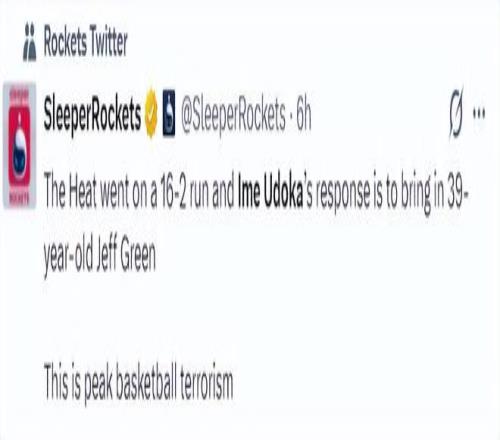 休媒也指責烏度卡,在熱火打出那一波16-2的攻防浪潮後,烏度卡沒有任何的調整,他隻將39歲的傑夫-格林給換上。這簡直就是恐怖主義的籃球巔峰。