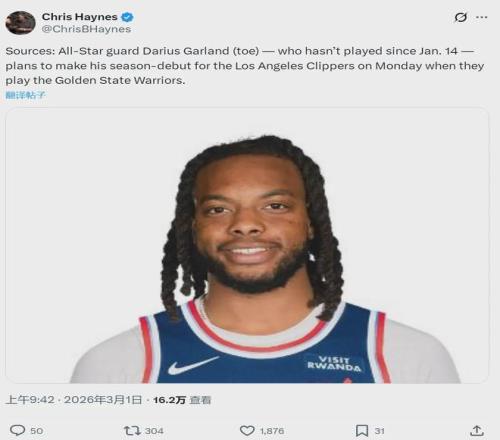 北京時間3月1日,據NBA名記Chris Haynes報道,快船全明星後衛達裏厄斯-加蘭,將在3月3日對陣勇士的比賽中迎來快船生涯首秀。過去一個半月,加蘭一直在處理他的腳趾傷勢。今年交易截止日被送到快船,但加蘭還沒出戰過。