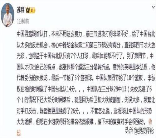 中國隊第四節搶了18個籃板, 李弘權在場的時間贏了中國台北隊14分。。。中國隊在三分球29中13(朱俊龍進了6個)的情況下還大部分時間落後,就是因為後衛和大秋被割裂,失誤太多,頻繁讓對手打反擊,陳盈駿更是獨得了26分。不管怎麽說,這場球讓中國隊的形勢大為緩解,但想在小組獲得好的排名依然很難,接下來的複賽對手會很強勁。