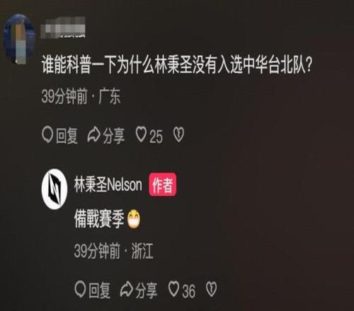 林秉聖此前曾入選中國台北男籃代表隊,但在此次窗口期落選,無緣出戰世預賽,有球迷在評論區詢問為什麽落選,林秉聖回複道是為了備戰賽季。