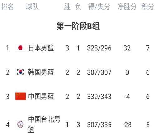 日本隊以3勝1負戰績來到小組第一,韓國隊第二個窗口期連負台北、日本,排名下滑到第二,中國隊一波2連勝後,和韓國隊同積6分暫居第三,台北1勝3負位列第四。