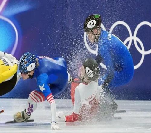 那是女子1500米四分之一決賽,短道速滑本來就險,選手貼著冰麵飛。快到終點時,美國選手桑托斯-格裏斯沃爾德一個動作引發連環撞,包括意大利名將豐塔納在內的好幾個人摔成一團。