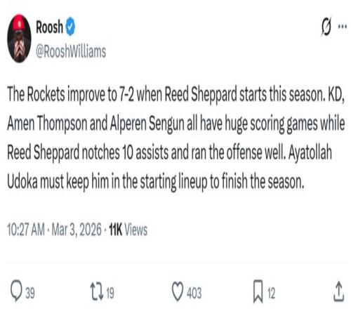 另外一名火箭媒體人RooshWilliams也給出相同看法:“謝潑德送出了10次助攻,很好地組織了進攻,烏度卡必須繼續將其留在首發陣容中直到賽季結束。”