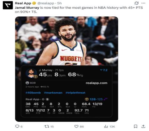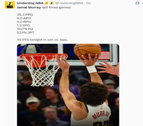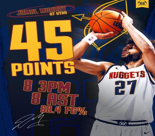 他在第三節三分7中5拿到18分1搶斷,末節2中2+罰球6中6拿到10分,整個下半場拿到28分。而約基奇全場比賽隻拿到22分12籃板5助攻,此役掘金就是靠穆雷才拿下的。