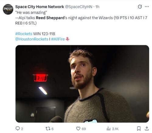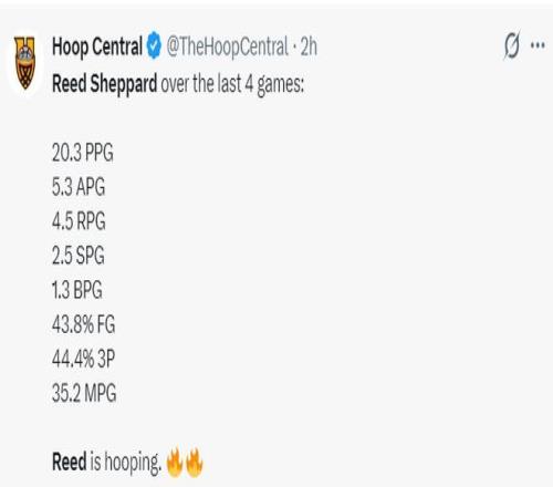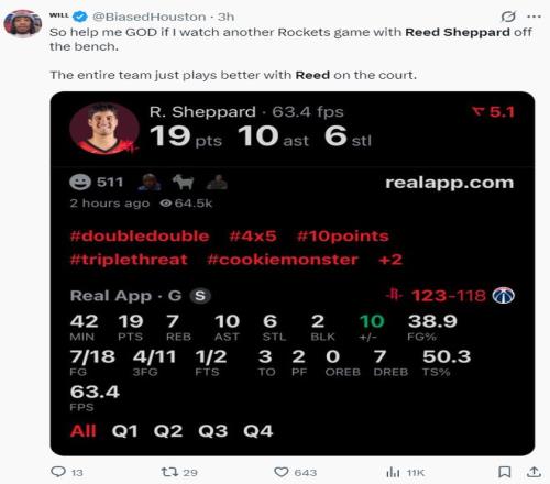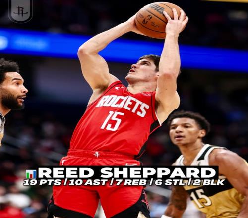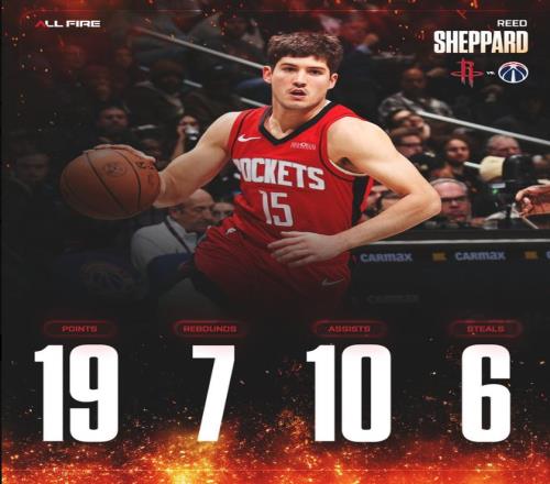此役後謝潑德最近四場比賽,場均35.2分鍾,拿到20.3分5.3助攻4.5籃板2.5搶斷1.3蓋帽,三分命中率44.4%,他本賽季先發的9場比賽火箭7勝2負。