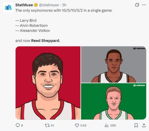 5.謝潑德是曆史第四位單場拿15+10+5+5+2搶斷的二年級新秀;