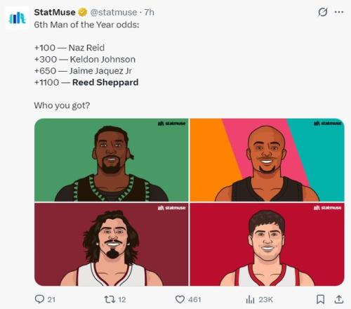 謝潑德也排在最佳第六人第四的位置,裏德第一、凱爾登第二、小哈克斯第三、謝潑德第四。