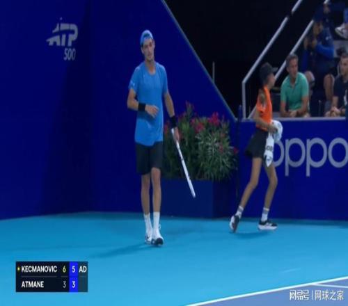 接發球的阿特馬內以15-40落後,在挽救了2個賽點後兩度將比分推進到局末平分deuce。凱茲曼諾維奇拿到第4個賽點時,他做好了發球準備,但阿特馬內動作緩慢,遲遲沒有做好接發球準備。