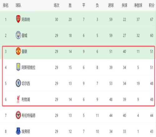 由於曼聯輸球,英超爭四格局也更加混亂了。截至目前,曼聯、維拉、切爾西和利物浦這4支爭四球隊,本輪的比賽都已經結束,由於切爾西在客場4-1大勝維拉,因此他們已經反超利物浦,排名回到第五位,而曼聯雖然繼續排名第三,但是他們隻領先第六的利物浦3分,爭四形勢隨時將發生逆轉。