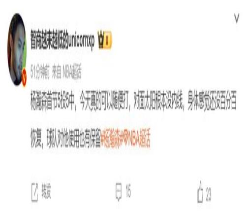 正如歐洲籃球專家王健所說,楊瀚森首節5中5可以隨便打,因為太陽根本沒內線,楊瀚森在身體還沒有百分百恢複的情況下打得非常輕鬆,球隊對楊瀚森的使用也有所保留。