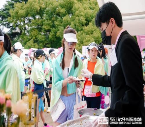 當天正值“三八”國際婦女節,在中山公園終點處,手持鮮花的男士向每一位衝過終點的女性跑者致以祝賀。在公園開闊的草坪上,組委會精心準備了各類精致甜點與清爽飲品,現場還設有專業的美妝美發服務區,幫助完賽跑者快速整理儀容,以最佳姿態記錄這一值得珍藏的時刻,在春光中定格屬於自己的高光瞬間。