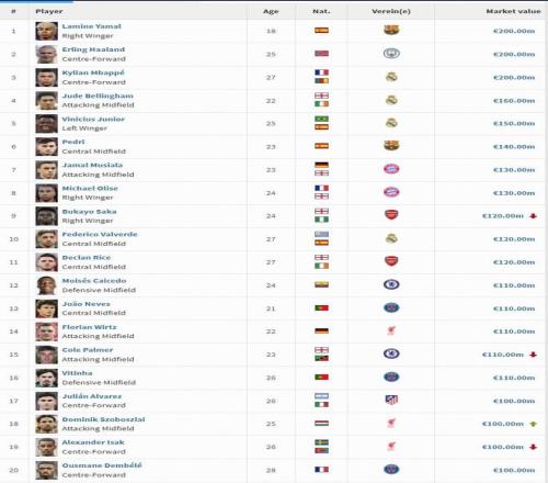 根據統計,到目前為止,世界足壇已經有了20位億元先生,其中身價最高的是亞馬爾、哈蘭德和姆巴佩,他們的身價都是2億歐元。