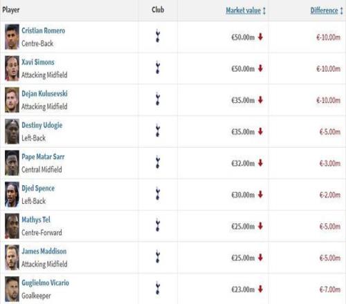 熱刺17人身價變更:16人身價下跌,羅梅羅等三人跌1000萬_24直播網