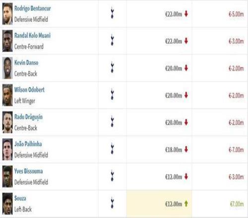 北京時間3月9日,德轉更新了英超聯賽球員的身價,熱刺一共有17人身價有變化,其中16人下跌,羅梅羅、哈維-西蒙斯和庫盧塞夫斯基均下跌1000萬歐元,僅有小將索薩上漲了700萬歐。