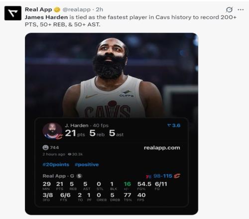 6.11場比賽完成200分50籃板50助攻並列騎士隊史最快;