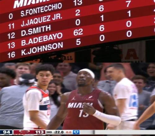 注意,此時的熱火已經以113-97領先16分,如果是正常輪換的話,阿德巴約應該在第四節前半段休息,看分差比較接近再上場、分差比較大就不上場。