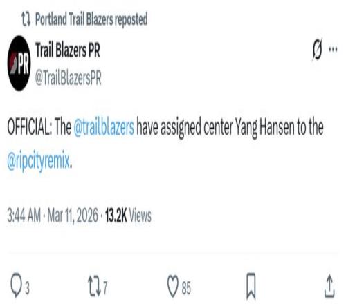 賽前開拓者官方宣布將中鋒楊瀚森下放至發展聯盟混音隊,本賽季楊瀚森代表開拓者出戰38場比賽,場均登場7.3分鍾可以拿到2.2分1.5板0.6助。