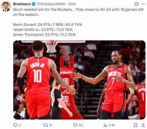 北京時間3月11日,火箭以113-99大勝猛龍。這場比賽火箭是在末節一波流擊垮猛龍,不過上半場是杜蘭特與小賈苦苦支撐,37歲的老將有體能時的確無解,火箭此役後拿到第40場勝利,火箭也重返西部第三的席位(湖人VS森林狼還沒打)。