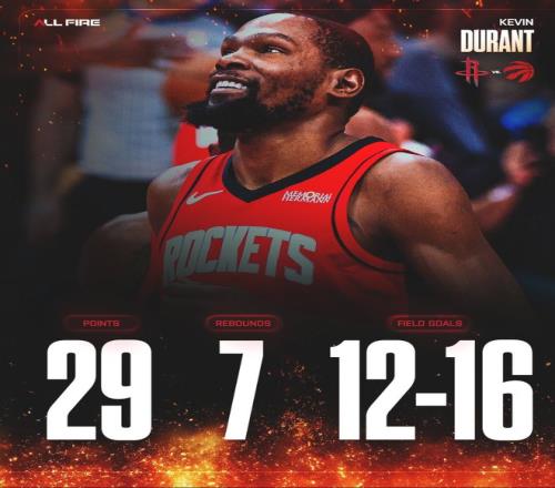 末節杜蘭特都還沒有登場,依靠小賈連拿8分幫助火箭拉開分差,末節KD隻打了2分鍾拿到2分2籃板1助攻1蓋帽就打卡下班了,全場比賽33分鍾,16中12,三分5中4,罰球2中1拿到29分7籃板2助攻2搶斷2蓋帽,命中率75%,三分命中率80%,真實命中率85.9%。