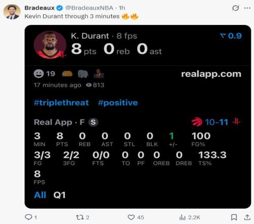 37歲的杜蘭特繼續被啃老,在申京狀態無比低迷的情況下,開場3分鍾裏杜蘭特一人拿到8分,首節杜蘭特7中5+三分2中2,拿到12分1籃板1蓋帽,杜蘭特的個人狀態就是火箭的基本盤。