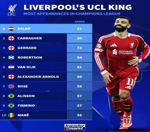 北京時間3月11日,德轉統計出了利物浦隊史歐冠出場數前10,首發出戰了與加拉塔薩雷1/8決賽首回合的薩拉赫也就此以81場超越卡拉格獨占紅軍隊史歐冠出場數第1。