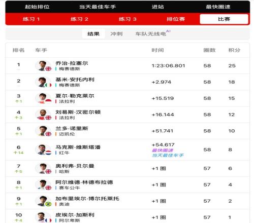 緊接著的正賽中,拉塞爾一路穩健領先,最終摘得本站冠軍,新秀安東內利也驚豔地收獲亞軍席位,而法拉利車隊的勒克萊爾則最終拿下季軍。