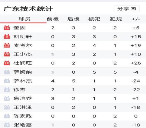 答案不妨從賽後的球員數據欄來找,賽後球員數據統計,不難看出,廣東隊的首發和替補陣容的正負值差距明顯,杜潤旺隻拿到3分,正負值+26,胡明軒第四節9中1,三分6中0,但正負值依舊有+15之多,比較讓人欣慰的是麥考爾,雖然隻得到了8分,但正負值高達+19(麥考爾搭配胡明軒效果不錯),廣東隊一陣容整體表現出色。