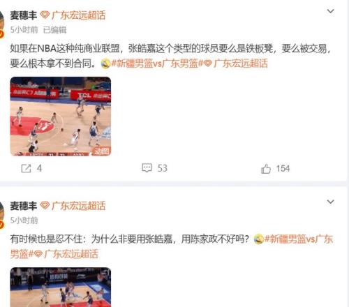 其中,要說罵的最狠的,還得是媒體人麥穗豐,看到張皓嘉在比賽期間的多次災難性表現,一向支持廣東隊的麥穗豐也忍不住發文嘲諷,表示:如果在NBA這種純商業聯盟,張皓嘉這個類型的球員要麽是鐵板凳,要麽被交易,要麽根本拿不到合同。