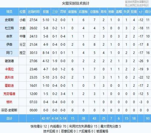 休息歸來約基奇三節未打完就完成三雙,掘金單節狂轟40分直接拉開20分以上的優勢,末節掘金開局再送18-9的攻勢徹底殺死比賽懸念,最終火箭客場93-129大比分慘敗掘金,賽季交手大比分1-3落後。