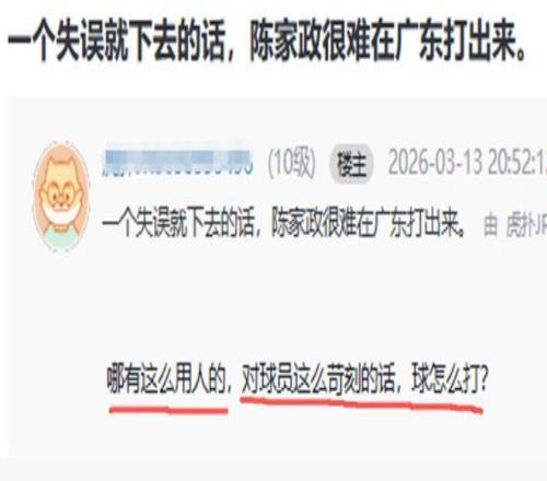 本輪廣東在客場以4分險勝深圳的比賽中,陳家政打了12分鍾,3中2,十分高效地拿到4分2籃板,而這4分全部來自首節。然而隻是因為一個失誤,杜鋒就直接將陳家政換下,之後幾無登場機會,這也引起了球迷的熱議:“一個失誤就下去的話,陳家政很難在廣東打出來”、“犯一次錯就被換下來,杜潤旺、張皓嘉在場上純副作用,就是不換,這要逼走隊裏的年輕人嗎?”